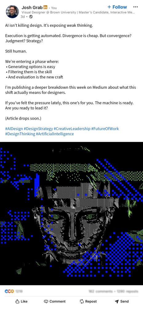 Execution is becoming instant. You can generate logos, layouts, campaigns and illustrations in minutes. Creating options is cheap… but judgment still belongs to designers.