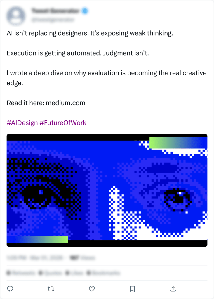LinkedIn reaches professionals already discussing AI, strategy and the future of creative work. This post positions me as a thought leader, sparks conversation and builds anticipation for my Medium article. The tone and visual focus on creative leadership resonate with designers, marketers and business leaders. Selecting appropriate hashtags and a visual that aligns with my article will engage new readers in a branded experience.